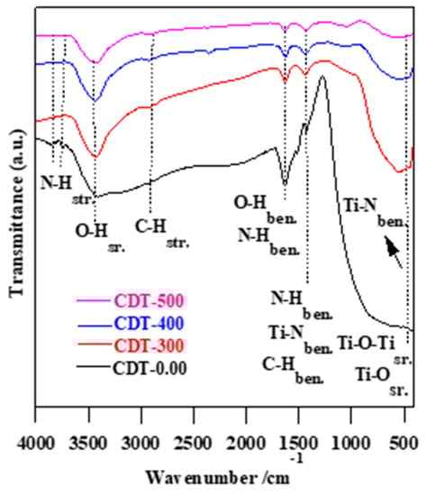 The existence of carbon and nitrogen for the obtained TiO2 powders was further confirmed by FTIR spectroscopy, as shown in Figure 7. It was found that prepared TiO2 samples displayed vibration modes at the 4000–400 cm−1 range, indicating the possible incorporation of C and N in the TiO2 lattice (see Figure 7 and Table 4) [,,,]. The Ti–O bond and Ti–O–Ti bridge stretching are located at 900–400 cm−1 [,]. The low FTIR bands located at 480 cm−1 are attributed to Ti-Nstr. bonds [,]. The bands located at 1416 cm−1 are related to Ti-Nben., C-Hben., and N-Hben. [,]. N-Hben. and O-Hstr. bonds are located at 1630 cm−1 [,,,]. The FTIR bands located at 2922 cm−1 are assigned to C-Hstr. []. The broad bands located at 3418 cm−1 are characterized to O-Hstr. [,,,]. The weak FTIR bands located at 3700–3800 cm−1 are due to N-Hstr. [,]. It is worth noting that the intensities of O-H, N-H, C-H and Ti-N vibration bands decreased with increasing calcination temperature, confirming XPS data, i.e., the thermal treatment caused a release of non-metal elements and/or chemosorbed H2O [,,].