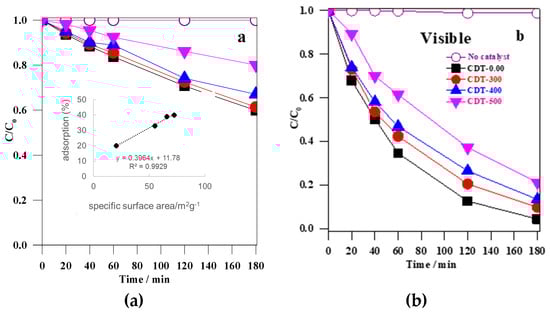 Change of the MC-LR concentration with initial concentration 10 mg L−1 versus reaction time: (a) under dark condition; and (b) under visible light illumination for 3 h using CDT-0.00, CDT-300, CDT-400, CDT-500 catalysts (0.3 g L−1) at pH 6.3.