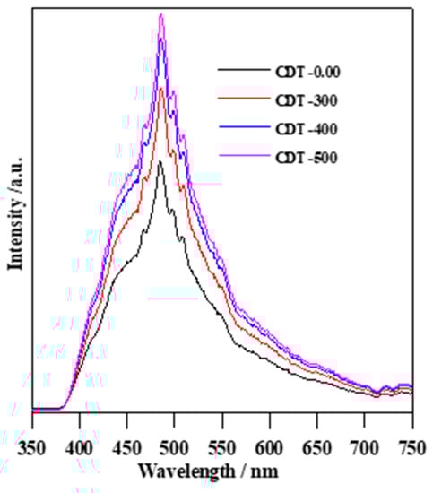 The photoluminescence (PL) spectroscopy has been used widely to investigate the charge separation/recombination of photogenerated charges. Additionally, the PL emission intensity is related directly to the recombination rate of the e−/h+ pairs, i.e., the lower is the PL emission intensity, the lower is the recombination rate, hence an increase in the photocatalytic activity of the materials [,]. Indeed, higher PL intensity of the sample CDT-0.00 than those of calcined samples (Figure 9) correlates well with photocatalytic activity (Figure 8), confirming the lower charge carriers’ recombination. The results indicate that PL peaks of all samples are located at the same position around 485 nm, which can be attributed to the free electron recombination process from the conduction band (CB) to the ground state recombination center []. The PL intensities increased with increasing the calcination temperature, i.e., the as-synthesized TiO2 catalyst (CDT-0.00) exhibited the lowest PL intensity indicating the lowest charge carriers’ recombination, and thus the highest photocatalytic activity for MC-LR degradation.