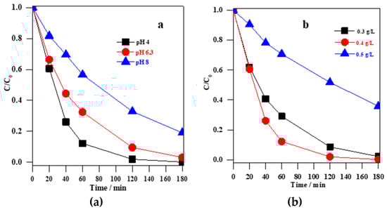(a) Photodegradation of 10 mg L−1 MC-LR in the presence of CDT-0.00 (0.4 g L−1) under visible irradiation at different pH values (4, 6.3, and 8); and (b) photodegradation of 10 mg L−1 MC-LR using different dosages of CDT-0.00 (0.3, 0.4, and 0.5 g L−1) under visible irradiation at pH 4.