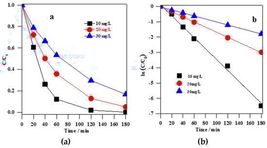 The influence of initial MC-LR concentration on the photocatalytic performance of as-synthesized C/N co-modified TiO2 with an initial TiO2 dose of 0.4 g L−1 at pH 4 is shown in Figure 11. It was found that an increase in MC-LR concentration resulted in a decrease in degradation efficiency. This obvious behavior is caused by the fact that higher concentration means higher competition (more molecules) for same content of reactive oxygen species, as well as the competition between oxidation by-products and original compound (MC-LR) for both adsorption (on the photocatalyst surface) and degradation. The MC-LR degradation presented a first-order behavior (as confirmed by logarithmic plot (Figure 11b)) with the reaction rates of 2.01 × 10−4 mmol L−1 (K = 0.034 min−1), 1.03 × 10−4 mmol L−1 (K = 0.017 min−1), and 0.73 × 10−4 mmol L−1 (K = 0.011 min−1) and degradation efficiency after 180-min vis irradiation of 100%, 95% and 83% at the initial MC-LR concentration of 10, 20, and 30 mg L−1, respectively.
