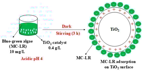 Finally, MC-LR adsorbed on the TiO2 surface can be degraded either directly by h+ or indirectly by formed ROS (Equations (4)–(6)) to be converted finally into non-toxic products, H2O and CO2, as shown in Equation (7).
