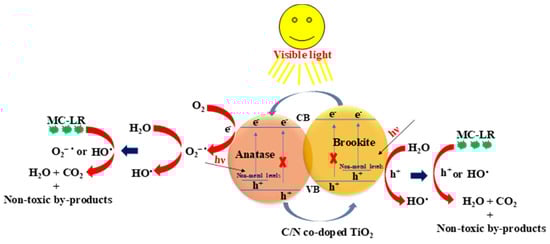 The proposed mechanism of the MC-LR photodegradation on C/N co-modified TiO2 photocatalyst is shown in Scheme 2. Firstly, vis irradiation could excite semiconductor only from the impurity energy levels (non-metal levels, considering surface modification with doping-like nature, e.g., surface oxygen replaced by nitrogen and carbon) to the conduction band, and leaving photo-generated holes at the impurity levels in both anatase and brookite phase, as presented in Equation (3).