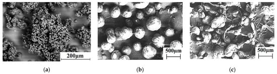 Micrographs of the ultra-high molecular weight polyethylene (UHMWPE) (a), polypropylene (PP) (b), and high-density polyethylene grafted with maleic anhydride (HDPE-g-SMA) (c) powders.
