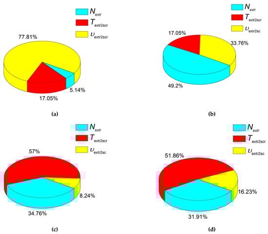 These results are shown in Figure 2a. They characterized the effect degree of the processing factors considering the levels of their change. The maximum effect on Young’s modulus was exerted by ‘the extruder screw rotation speed vextr2scr’, while the total effect of ‘the amount of the extruded material Nextr’ and ‘extrusion temperature Textr2scr’ factors did not exceed 25%. Accordingly, the extruder screw rotation speed had to be the maximum to achieve the highest Young’s modulus value. It is highly likely that this was associated with an increase in pressure and, respectively, an intensification of intermolecular interaction and better dispersion of the components. Figure 2b–d present pie charts for other physical and mechanical characteristics and the effect of the factors on them.