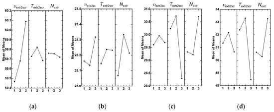 The effect of the factors on Young’s modulus (a), yield strength (b), tensile strength (c), and elongation at break (d) of the composites compounded by the twin-screw extrusion.