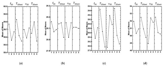A line graph in Figure 3a additionally illustrates the effect of the factor levels (the processing parameters) on Young’s modulus. An increase in the extruder screw rotation speed from 40 and 60 rpm resulted in enhance Young’s modulus by approximately 1% (from 987 up to 1000 MPa). Other factors changed without a pronounced trend and in a much lower range of the values. Thus, from the point of view of Young’s modulus, the most significant factor was the extruder screw rotation speed, the value of which was supposed to be at its maximum.