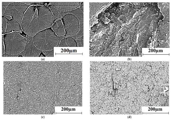Figure 6c,d show SEM micrographs of the microstructure of the composites manufactured by compression sintering and the FDM method from the granulate after the twin-screw extrusion. The high degree of the structure uniformity of the polymer composite under conditions of the effective polypropylene (as well as HDPE-g-SMA) dispersion in the UHMWPE matrix should be noted. This effect had been realized due to compounding the mixture in the twin-screw extruder, as well as the difference in polyethylene and PP melting points. However, the spherulite structure had not been formed in these cases. In addition, the structure of the composite fabricated by compression sintering was denser (Figure 6c) compared to that manufactured by the non-optimized FDM method (Figure 6d). This result was in good agreement with the data on the physical and mechanical properties of the composites (Table 8).
