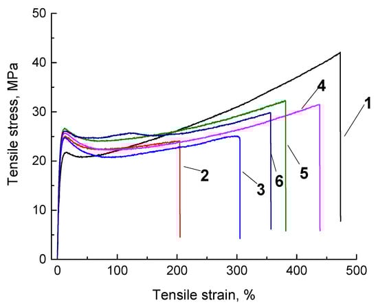 Engineering stress–strain curves for neat UHMWPE (1) and the ‘UHMWPE+17 wt.% HDPE-g-SMA +12 wt.% PP’ composite: fabricated by the non-optimized powder hot pressing (2), fabricated by the non-optimized granules hot pressing (3), fabricated by the optimized granule hot pressing (4), manufactured by the non-optimized FDM method (5), manufactured by the optimized FDM method (6).