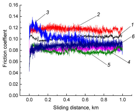 The friction coefficients of neat UHMWPE (1) and the ‘UHMWPE+17 wt.% HDPE-g-SMA +12 wt.% PP’ composite: fabricated by the non-optimized powder hot pressing (2), fabricated by the non-optimized granule hot pressing (3), fabricated by the optimized granules hot pressing (4), manufactured by the non-optimized FDM method (5), manufactured by the optimized FDM method (6).