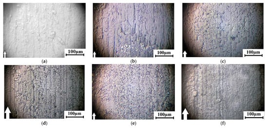 Optical images of the wear track surfaces at 60 N × 0.3 m/s: neat UHMWPE (a) and the ‘UHMWPE + 17 wt.% HDPE-g-SMA + 12 wt.% PP’ composites: fabricated by the optimized powder hot pressing (b); fabricated by the non-optimized granule hot pressing (c); fabricated by the optimized granule hot pressing (d); manufactured by the non-optimized FDM method (e); manufactured by the optimized FDM method (f).