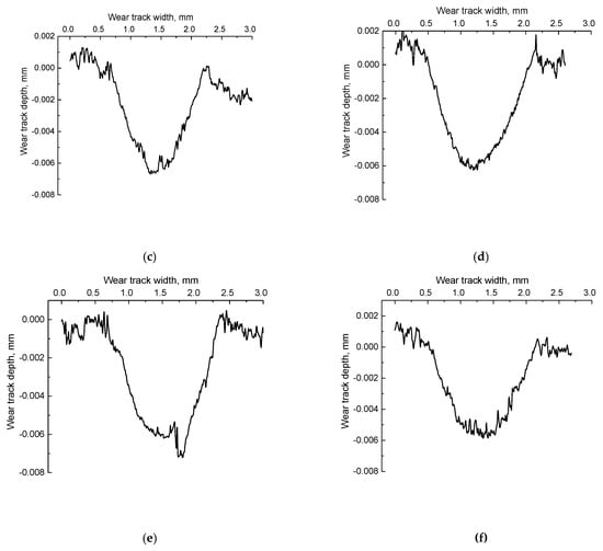 The cross-section wear track profiles at 60 N × 0.3 m/s: neat UHMWPE (a) and the ‘UHMWPE + 17 wt.% HDPE-g-SMA + 12 wt.% PP’ composites: fabricated by the optimized powder hot pressing (b); fabricated by the non-optimized granule hot pressing (c); fabricated by the optimized granule hot pressing (d); manufactured by the non-optimized FDM method (e); manufactured by the optimized FDM method (f).
