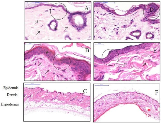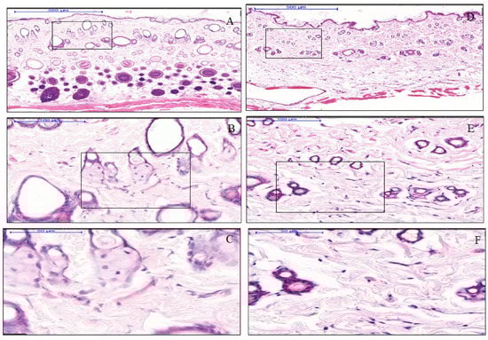Scanning power view of hematoxylin and eosin (H&E) stained rat skin from the frontal regions. Infiltration of the inflammatory cells was not detected either in the control or in the expanded tissues. The dense band of typical lymphocytic infiltration in the superficial dermis was not present, similarly in the dermis, hypodermis expanded tissues samples (A–C), and control tissue samples (D–F). Expanded specimens (A–C) did not exhibit vascular degeneration nor prominent necrosis of individual keratinocytes.