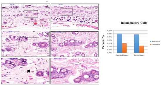 Hematoxylin and eosin (H&E) staining section of control (D–F) and expanded (A–C) rat skin. Representative serial magnifications of the dermis show isolated resident neutrophil (shown by black arrows in C) and eosinophil (shown by black triangle in C) in the connective tissue. The bar chart compares the percentage of inflammatory cells (neutrophils and eosinophils) in expanded and control tissues, with 0.30% neutrophils and 0.15% eosinophils in the expanded tissues, while 0.29% neutrophils and 0.11% eosinophils in control tissues.