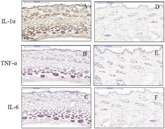Immunohistochemical staining of IL-1 (A,D), TNF-α (B,E), and IL-6 (C,F) in expanded (A–C) and control (D–F) tissues. Expanded tissues (A) show strong cytoplasmic and nuclear positivity (brown color) of IL-1in the epidermis, dermis, and hypoderm compared to controls (D). Enhanced expression of IL-1 was detected in the nucleus of keratinocyte. Additionally, all the collagen fibers in the dermal layer were IL-1-positive compared to controls. However, expression of TNF-α and IL-6 did not show any differences between the expanded (B,C) and control tissues (E,F).