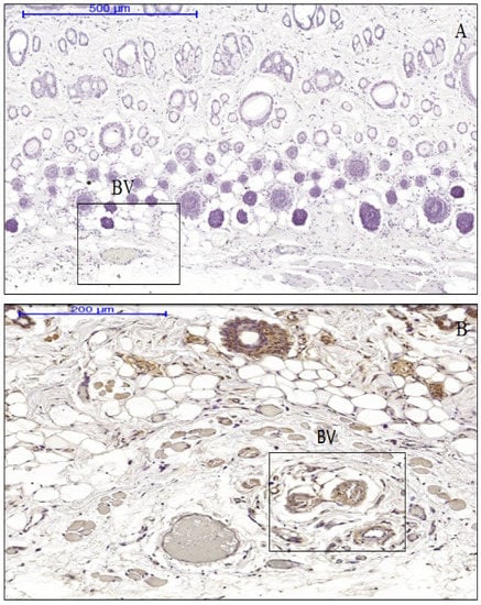 Comparison of IL-1 expression in the blood vessel regions in hypoderms. Endothelium cell in the hypoderm of the expanded tissues (B) showed strong positive staining for IL-1 (shown in boxes) compare to that in the controls (A). BV = blood vessels.