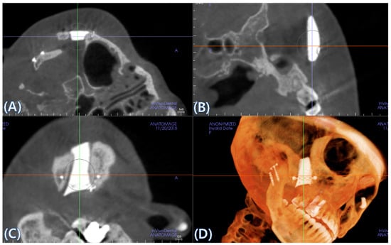 CBCT was performed immediately after surgery and 6 months after surgery to evaluate bone fusion, the fusion area, and the immobilization of implants. A CT Digital Imaging and Communications in Medicine (DICOM) file, taken 6 months after surgery, was loaded into the in vivo 5 software (Anatomage, San Jose, CA, USA). The multi-planar plane was re-oriented so that the longest axis of the implant was perpendicular to the reference plane, and the minor axis was horizontal to the reference plane (Figure 2B–D). A cross-section was created based on the newly reorientated plane (Figure 2A).