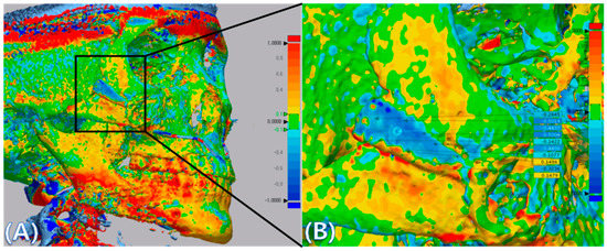 (A) CT data were converted into stereolithography (STL) files and imported into Geomagic Control X, and superimposition of CT data taken immediate post surgery (reference data) and CT data taken at 6 months after surgery (measured data) was performed using the Geomagic Control X software. The images were positioned using both the Initial Alignment and Best-Fit Alignment tools. The colors show overlays of 2 CT scan data. (B) Deviations between reference data and measured data were measured at ten evenly spaced points on the implants. The specific values of deviation on the implants are demonstrated. The value of deviation across the entire scan is color-graded from 1 mm (blue) to +1 mm (red).