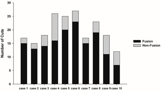 All data were analyzed using SPSS (Statistical Package for the Social Sciences) (IBM, Chicago, IL, USA) (α = 0.05). Between-case differences for distances between random points were analyzed with a linear mixed-effects model (LMEM), which was made with cases as independent fixed factors, and each distance as a random effect. The number of cuts was analyzed with an LMEM, which was made with cases and fusion status as independent fixed factors, and each cut as a random effect.