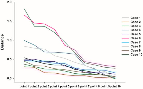 Table 3. shows the distance displacement of the measurements at 10 randomly distributed points on the 3D printed BGS-7 implants. There were statistically significant differences in the distance displacement of the 10 BGS-7 implants (p < 0.001). LMEM also showed a significant difference between cases (F(9, 16.76) = 6.095, p = 0.001) (Figure 5). The maximum and minimum mean distance displacements were 0.889 and 0.1156 mm, respectively, while the mean deviation distance displacement of all 10 implants was 0.4149 mm.