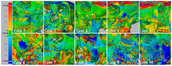 In the color map using the 3D inspection program, the displacement was the same as the measured displacement (Figure 6). In Figure 6, if the outer surface is blue, it means that the CT taken at 6 months after surgery is lower than the CT taken immediately after surgery. Most implants were displaced downward 6 months after surgery when compared to CT taken immediately after surgery. This result shows that the implant is attached closer to the surrounding bone under the downward pressure of the skin.