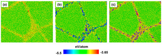 In the following we shall investigate the influence of solute elements on the plasticity of nc samples by analyzing the deformation mechanisms at different strain values. As mentioned in Section 3.1, the stress–strain curves exhibited linear dependence in strain range up to 2%. In this regime no dislocations or twin activities were observed. Thus, it was assumed that the deformation mechanism in this stage was rather due to GB activities, i.e., the deformation was localized in GB. We examined this assumption by calculating the von Mises atomic local shear strain (), given by Equation (1) [].