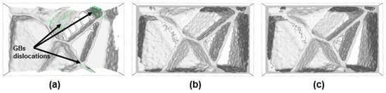 During tensile simulation, the identification of dislocations was made via the dislocation extraction algorithm (DXA) [], while the structural defects were analyzed by the Crystal Analysis Tool (CAT), based on adaptive common-neighbor analysis, developed by Stukowski et al. [,]. Visualization of all molecular dynamics (MD) simulation snapshots were made via the open source software Ovito [] and Atom Viewer [,].