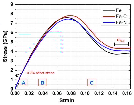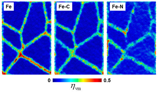Figure 5 shows the typical stress–strain curves of all nc samples uniaxially loaded up to 16% strain. Three different regimes can be highlighted: (1) elastic regime up to about 2% strain, (2) GB sliding regime, and (3) plastic regime. The 0.2% offset yield strength was 1.09, 1.28, and 1.12 GPa for Fe, Fe-C, and Fe-N nanocrystalline samples, respectively. Beyond this value, the stress increased with strain up to peak stress, corresponding to the emission of the first dislocation, at about 7.61, 7.82, and 7.46 GPa for nc Fe, nc Fe-C, and nc Fe-N samples, respectively. The peak stress was greatly amplified compared to the corresponding experimental values [,] because of the high strain rate inherent in MD simulation. Hence, the peak stress could not be used as a measure of material strength; rather, the flow stress () was used since it is insensitive to the strain rate.