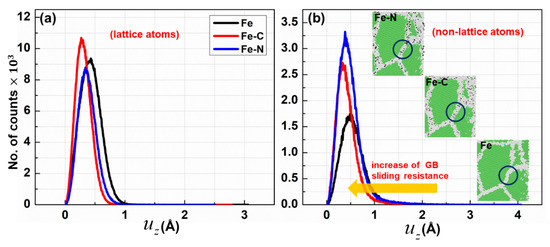 Moreover, to examine the impact of solute atoms on the grain boundaries by calculating the atomic displacement perpendicular to the loading direction . Figure 7 displays the probability density of per atom for the lattice and non-lattice atoms. As illustrated in Figure 7, the value of of non-lattice atoms decreased when foreign atoms were added to ferrite, i.e., an increase of GB sliding resistance, suggesting that the enhancement of the material strength was due to stabilizing the GB and preventing grain growth.