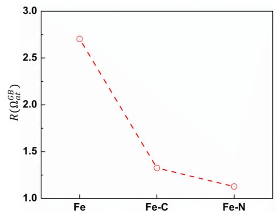 To understand the influence of foreign atoms on the GB sliding, we calculated the free volume of GB atoms. This quantity is particularly useful as stress-driven free volume migration is one of the mechanisms that mediates GB sliding []. We first identified GB atoms using CNA technique and then we applied Voronoi analysis, implemented in VORO++ [], to calculate the volume per GB atom . We defined as a ratio between the number of GB atoms with to the number of GB atoms having where is the cohesive energy of Fe atom in bulk bcc lattice and equals 11.77 Å3/atom. Figure 8 shows the value of corresponding to different nc samples. Obviously, nc iron had the largest , i.e., the largest free volume; thus, the propensity of GB sliding was higher. When foreign atoms such as carbon or nitrogen (with a smaller size compared to iron atoms) are added, the value of decreases. As a result, the available free volume that can assist GB sliding was reduced, leading to an increase of GB sliding resistance.