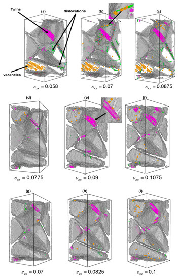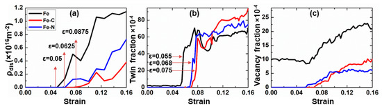 Finally, the formation of vacancies during plastic deformation was observed. Obviously, as depicted in Figure 9b and Figure 10c, the fraction of vacancies was more pronounced in the case nc iron sample. The detailed analysis of vacancies’ fraction with strain, cf. Figure 10c, indicates that the onset of vacancies’ formation occurred at higher strain for samples containing foreign atoms. Thus, the presence of carbon and nitrogen suppressed the formation of vacancy nanoclusters. Also, it was noticed that the strains at which the vacancy formation starts were comparably equal to the strains at which twins or dislocations nucleated. This fact suggests that the formation of vacancies was closely related to the interplay between dislocations and deformation twins during deformation. The formation of vacancy nanoclusters was not surprising, as they may be generated as a result either from a rough motion of a dislocation under high stress, Figure 9b, which eventually leads to the formation of lattice defects as reported in [] or from the deformation twins, Figure 9e. This mechanism has been experimentally verified by electron microscopy of high-speed deformation of metals and later explained by Seeger [].