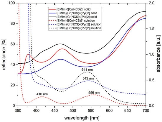UV/Vis spectra in diffuse reflectance as well as in an acetonic solution of selected (EMIm)x[Cr(NCS)4L2] (x = 3: L = NCS; x = 1: L = Pyr, Pic) compounds are depicted in Figure 1. Full information on all transitions are given in the Experimental section and maxima for compounds exhibiting the [Cr(NCS)6]- anion are found at 413 (416) and 552 (556) nm, for L = Pyr at 535 (543) nm, and for L = Pic at 537 (541) nm, respectively. These values closely resemble the ones found in the literature and the ligand field strength is also in accordance [,,,,].