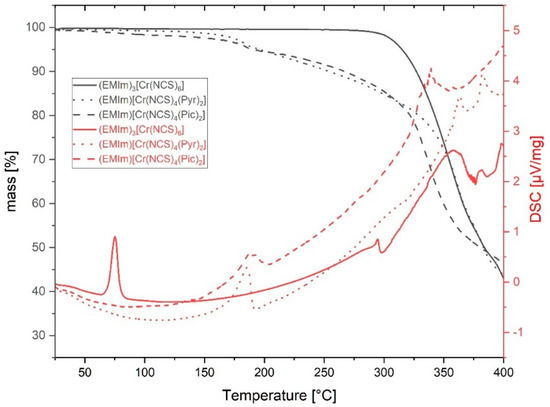 Thermogravimetric (black) and DSC (red) results of samples of (EMIm)x[Cr(NCS)4L2] (x = 3: L = NCS; x = 1: L = Pyr, Pic) in a N2 atmosphere.