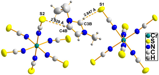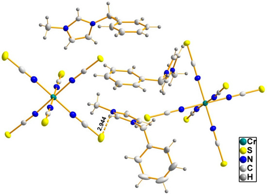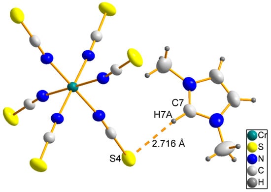 Thermal ellipsoid plots of the structural units in (DMIm)3[Cr(NCS)6], (BMIm)[Cr(NCS)4(Pyr)2], (EMIm)[Cr(NCS)4(Pic)2], (EMIm)3[Cr(NCS)6], and (BenzMIm)3[Cr(NCS)6] are given in Figure 3, Figure 4, Figure 5, Figure 6 and Figure 7, respectively. Figure 3, Figure 4, Figure 6 and Figure 7 also depict the shortest hydrogen contacts (C–H···S) between the isothiocyanato ligands of the complex anions and the hydrogen atoms of the cations. Except for these shortest hydrogen contacts between cations and anions, additional hydrogen anion–anion interactions seem to be present in the molecular structure of (EMIm)[Cr(NCS)4(Pic)2] (Figure 5). This behavior has not yet been reported in comparable molecular structures of Reineckate-related compounds in the literature.