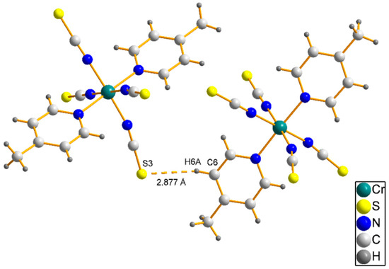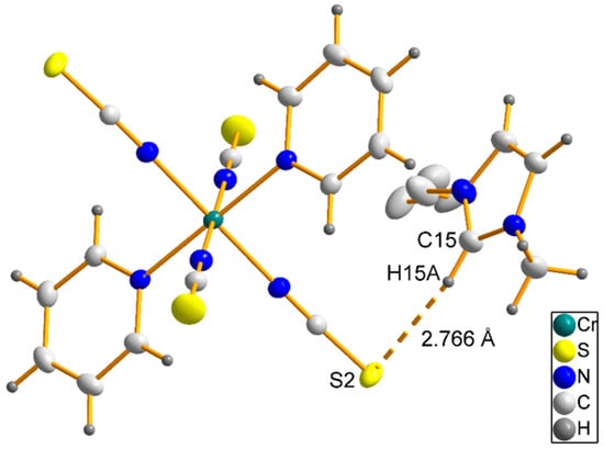 Anion–anion pairing in (EMIm)[Cr(NCS)4(Pic)2] via short hydrogen contacts with atom labeling scheme depicting the shortest C–H···S contact (thermal ellipsoids are drawn at the 30% probability level; disordered cation omitted for clarity).