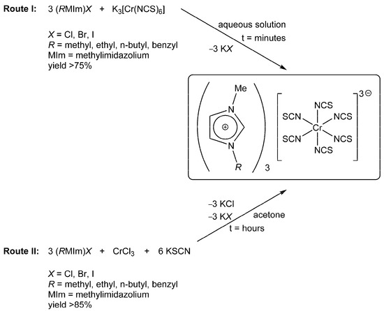 The two general synthetic approaches for the syntheses of complexes of the general formula (RMIm)3[Cr(NCS)6] (R = methyl, ethyl, n-butyl, benzyl; MIm = methylimidazolium).