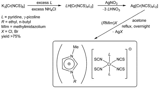 The route for the heteroleptic complexes of the formula (RMIm)[Cr(NCS)4L2] (R = ethyl, n-butyl; MIm = N-methylimidazolium; L = pyridine, γ-picoline) is given in Scheme 2. The general synthetic procedure includes a three-step reaction pathway starting from K3[Cr(NCS)6]. In a first step, K3[Cr(NCS)6] is reacted with and in excess L (L = pyr, pic), afterward the LH[Cr(NCS)4L2] compound is further transferred into its Ag salt. A subsequent salt metathesis reaction with ionic liquid precursors (RMIm)X leads to the final products (RMIm)[Cr(NCS)4L2] in moderate yields.
