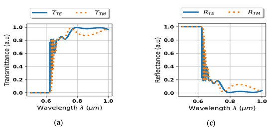Further analysis is focused on transmittance and reflectance of the considered system shown in the Figure 2. As we can see in the Figure 4a,b, the proposed device reveals strong rejection, i.e., no transmission, for light of arbitrary polarization for wavelengths shorter than approximately 0.625 μm. It is noteworthy that the transition between rejection and transmission range is accompanied with side lobes of oscillatory character, which is typical for edge and band optical filters [39]. Again, it is worth noting that this behavior cannot be predicted within the scope of local approximation, compare Figure 4a–d.