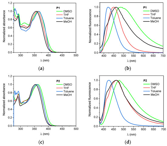 Table 1 collects the fluorescence lifetimes obtained by deconvolution of decay curves (Figure 3) using, in most cases, the double-exponential fit. Analysis of the results indicates the contribution of the long (ca. 0.8–3.9 ns) and the short (ca. 74 ps–0.252 ns) lifetime components, with the share of the short-lived component being dominant in all solvents tested, as indicated by its amplitude. Presumably, the fluorescence from the non-relaxed excited state is related to the sort lifetime component, while the nanosecond fluorescence lifetime can be attributed to the relaxed state of CT character. The emission decay curves were well fitted with a mono-exponential function only in CHCl3. The determined fluorescence lifetimes were ca. 1.2 and 1.3 ns for P1 and P2 compounds, respectively.