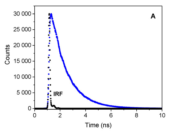 An Edinburgh Instruments single-photon counting system (FLS920P Spectrometers) was applied to record fluorescence decay curves. The excitation of the sample was performed using a picosecond diode laser. It generates pulses of about 55 ps at 375 nm. The dyes were studied at dilute solution (0.2–0.3 in a 10 mm cell). The fluorescence lifetimes were determined by deconvolution of the fluorescence decays were using double-exponential functions. The average lifetime, τav was calculated according to Equation (2):