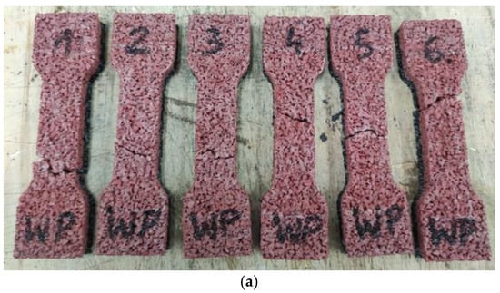 Process of the tensile strength testing for all prepared samples proceeded the same way. In addition, all tested samples, regardless of the composition and content of individual components, showed high ductility during the tests; therefore, their destruction was not abrupt. First, the sample grew in length (Figure 10b). After reaching the maximum elongation, the first cracks appeared (Figure 10c), which gradually progressed, causing the complete rupture of the specimen; see Figure 10d.