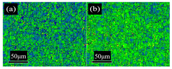 The local misorientation can be used to analyze the misorientation change in the grain of the plastic deformation metal, which is related to the dislocation density of the material, so it can indirectly reflect the relative strength of the residual stress [13]; that is, it can indirectly reflect the change of the secondary cold reduction rate. Figure 6 shows the local misorientation distribution with different secondary cold reduction rates, the closer the color was to red, the larger the grain misorientation was; the maximum misorientation is 15°. The blue region decreased with the increase in the secondary cold reduction rate. When the secondary cold reduction rate reached 25%, the color of some grains reached red, as shown in Figure 6c, implying an increase in the substructure or the dislocation density.