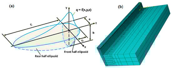 This thermal model can be used to forecast thermal characteristics such as heat flow distribution and temperature distribution at each time step allowing asymmetries in heat distribution across the molten pool to be modeled. For positive and negative x semi-axes, two alternative power distribution functions are constructed, which allows asymmetries in heat distribution across the molten pool to be modeled. The power density distribution functions are shown in Equation (1). The semi-axes of two ellipsoids centered at the origin of the frame of reference, as shown in Figure 2, are the coefficients af,r, b and c. Since the parameter a has a double subscript, separate values are utilized depending on the x sign (af for positive and ar for negative), resulting in two distinct functions. The spatial region where the power density decreases are represented by an ellipsoid surface to 5% of its previous high value. The semi-axes of ellipsoids are usually adjusted according to the size of the molten pool []. The Goldak model, as previously indicated, does not take into account the true power distribution between filler and base metal. In GMAW, arc power is provided to the molten pool in two manners: direct transfer from the electric arc to the base metal and droplet enthalpy transfer of filler metal melting energy. The power utilized to melt filler metal accounts for nearly half of the overall arc power, according to previous study [,]. Equations (1) and (2) shows the power density distribution functions.