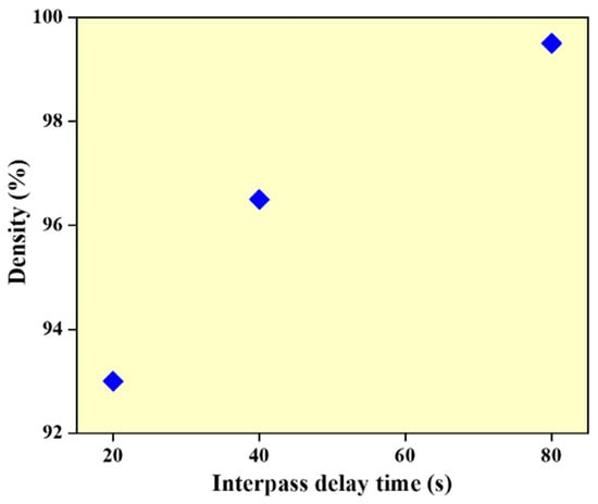 The density of WAAM samples is measured using Archimedes’ principle [] and volume-based measurements performed with a hydraulic scale. The density measurement using deionized water show that the density of the wall structures is 93%, 96.5% and 99.5% for walls built with interlayer delay of 20, 40 and 80 s, respectively (refer to Figure 3). This can be due to a reduction in the melt-pool temperature with an increase in the interlayer delay resulting in reduced vaporization effects and melt-pool turbulence.