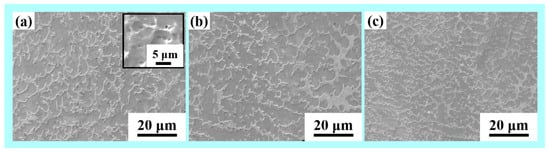 Figure 5 presents the microstructure of the built wall structures obtained using scanning electron microscopy. The temperature range of interest for stainless steel is 800 to 500 °C, as this is where the majority of the microstructural changes occur. This is the temperature range where austenite undergoes its solid-state transformation. As a result, in WAAM developed micrographs, the interlayer delay duration is critical. The dark gray region δ phase exhibits fine vermicular morphology within the light gray γ phase matrix. The second δ phase is embedded in the γ matrix and a large number of small holes (the darker region with circular structure) were also distributed in the matrix due to the high interlayer temperature because of low interlayer delay as shown in Figure 5a. A part of δ phase re-dissolves in γ phase and the retained δ phase exhibits vermicular morphology owing to the effects of subsequent thermal cycles. A large number of equiaxed grains and cellular dendrites were formed and grain size was increased for the lower interlayer delay sample (20 s). The ferrite exhibits reticular morphology within the austenitic. The walls built with higher thermal delay show finer grains as compared to walls built with lower thermal delay samples, which is mainly due to an increase in the cooling rate with an increase in delay time. With an increase in interlayer delay time, a reduction in the preheat temperature on the surface of the previously built layer is observed, which results in an increase in the thermal gradient and cooling rates [,].