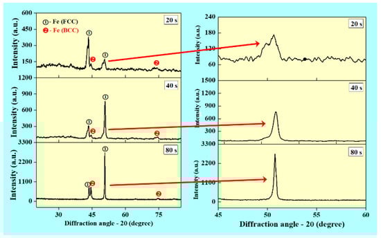 Figure 6 presents the XRD pattern of the WAAM deposited SS 316L wall structures. It shows the presence of bimodal microstructure with both austenitic and ferritic phases coexisting at the same time. This is mainly due to non-equilibrium solidification during the WAAM process. The estimated values of crystallite size are 15.55, 12.27 and 8.55 nm for walls built with interlayer delay of 20, 40 and 80 s, respectively. The crystallite size is reduced with an increase in the interlayer delay mainly due to an increase in the cooling rate. It is observed that peak width increased with an increase in the interlayer delay, which is evident from the variation in the crystallite size. A magnified view of the peaks as observed in Figure 6 indicates a shift in the peak position, which can be due to variation in the lattice spacing with an interlayer delay. As the interlayer delay changes, the thermal gradient and thermal strain changes, which results in the shifting of peak position [].