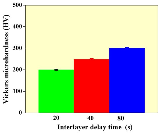 Figure 7 presents the average micro-hardness of the WAAM built wall structures with different values of interlayer delay. It can be observed that the microhardness increased from 190 to 300 HV with an increase in interlayer delay. The higher hardness at 80 s is mainly due to the formation of finer grains as compared to walls built with 20 and 40 s. It can also be observed that the micro-hardness of the WAAM built structure is higher than conventionally built SS 316L (170 HV) at all process conditions []. This is due to the finer grain structure that is generally observed in WAAM built samples than compared to conventionally processed samples.