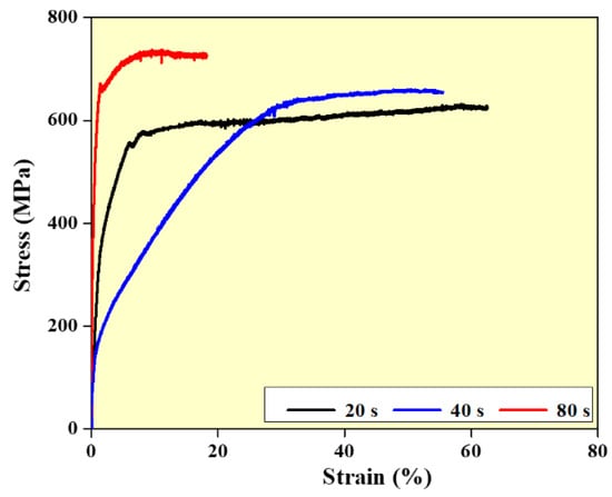 Compression studies are carried out to investigate the impact of interlayer delay on the compressive characteristics of the wall structures (Figure 8). It is observed that higher strength values are observed for walls built with an interlayer delay of 80 s samples. This is mainly due to the finer grain structure observed in the walls built with higher interlayer delay. In addition, the higher density of the walls built with higher interlay delay also influences the strength values [,,,].