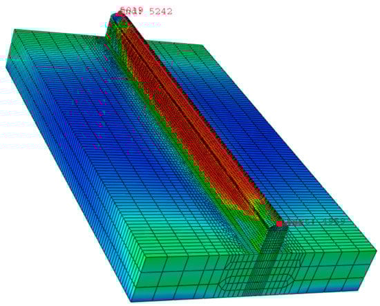 The analysis uses the GOLDAK heat source model, which reliably predicts transient temperature distributions []. The Goldak model, which is depicted in Figure 2, specifies a heat generation per unit volume in a moving frame of reference. The x-axis is in the feed direction, the y-axis is in the arc aiming direction and the right-hand rule determines the y-axis. The element size in the wall was required to be less than 1 mm in X, 0.6 mm in Y and 0.8 mm in the Z direction based on the mesh sensitivity results. The best aspect ratio for the element size was found to be one, which resolved the convergence issue and provided accurate results. The selected mesh for the wall consisted of cubic elements, with 180, 5 and 16 elements in the X, Y and Z directions, respectively (as shown in Figure 2b). The mesh size was doubled in the X and Z directions in the bedplate to reduce the computational time. The mechanical and thermal properties of the material examined in this work and the numerical framework are followed from previously reported work [,]. Table 3 presents the material properties used for simulation.