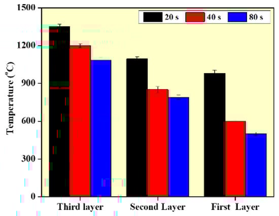 Figure 10 presents the effect of interlayer delay on the preheat temperature at different values of interlayer delay. The shorter interlayer delay time results in higher preheat temperature, which has a preheat effect on the deposition of the subsequence layers. In addition, as the deposition moves from the bottom layer to the top layer, the preheat temperature at a particular delay time also increases. This is mainly due to the rapid heat dissipation at the lower layers due to the substrate effect. As the deposition moves to the top layer, heat accumulation increases and the heat dissipation rate reduces. As the deposition proceeds from lower to higher layers, the width of the wall increases, which is caused by the molten metal’s viscosity changing during the deposition since viscosity is temperature dependent. As the temperature of the surrounding atmosphere rises, the viscosity of the molten metal reduces. Thus, at higher layers and lower interlayer delay, the outward flow of the melt pool will be higher resulting in larger width values. The variation in the microstructure and mechanical properties can also be explained with the help of the preheat temperature values presented in Figure 10. The lower preheat temperature at higher interlayer delay results in higher thermal gradients and higher cooling rates, which further results in finer grain structure and higher mechanical properties at the higher interlayer delay []. The simulated temperature is compared with experimentally obtained temperature values and it is provided in form of an error bar, as shown in Figure 10.
